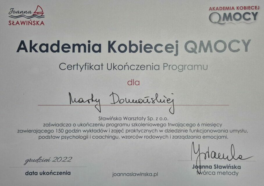 Przez pół roku uczestniczyłam w intensywnym programie rozwojowym u Joanny Sławińskiej pod nazwą Akademia Kobiecej QMocy. Odkrywałam i koiłam traumy rodowe, okołoporodowe, życiowe. Regularnie biorę udział w warsztatach organizowanych przez Joannę, w tym w niezwykłych wyjazdowych kręgach kobiet na Krecie o boskiej nazwie „Między nami boginiami”.