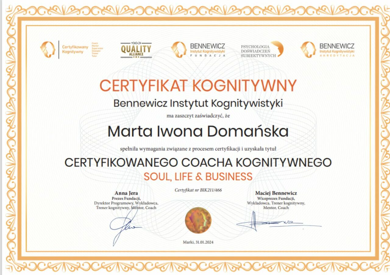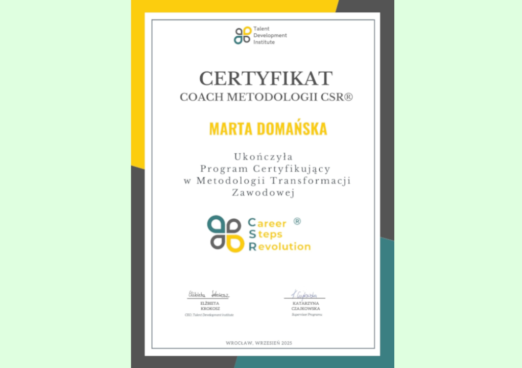 Szukając własnej nowej drogi zawodowej wzięłam udział w kursie Certyfikowany Coach Kognitywny w Instytucie Kognitywistyki Macieja Bennewicza. W styczniu 2024 r. zostałam Coachem Kognitywnym. Dzisiaj to ja mogę pomóc Tobie w odkrywaniu i osiąganiu Twoich celów. Od września 2025 r, jestem także certyfikowanym coachem metody CSR – Career Steps Revolution, procesu pomagającego w transformacji zawodowej.