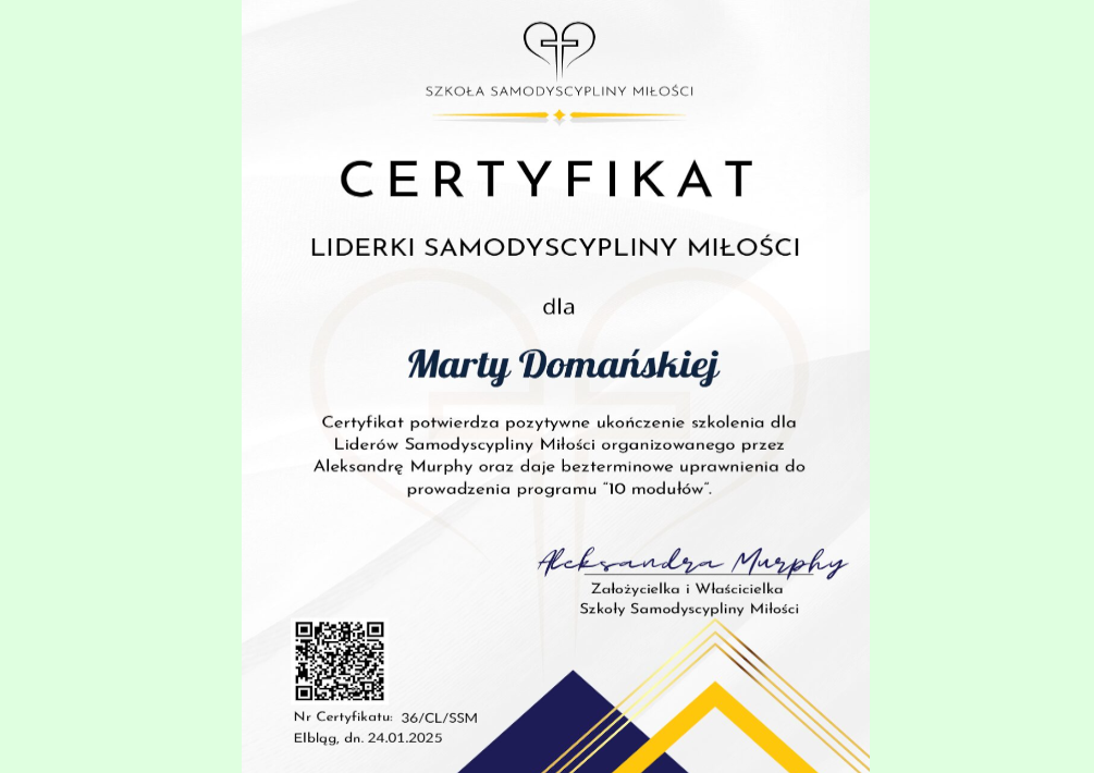 Od września 2023 r. korzystam z metody Aleksandry Murphy pn. Samodyscyplina Miłości. Moim celem jest, poprzez wprowadzanie w życie narzędzi usystematyzowanych przez Olę w kompleksowy program, przywrócenie „ustawień fabrycznych” w ciele i w myśleniu poprzez pozbywanie się toksycznych złogów tłuszczu i niewspierających przekonań. Od maja do grudnia 2024 r. prowadziłam przez ten proces kameralną grupę kobiet chcących poprawić jakość własnego życia, wziąć za nie odpowiedzialność i wybierać to co im służy i buduje życie jakiego pragną, w zgodzie z ich potencjałem i powołaniem.